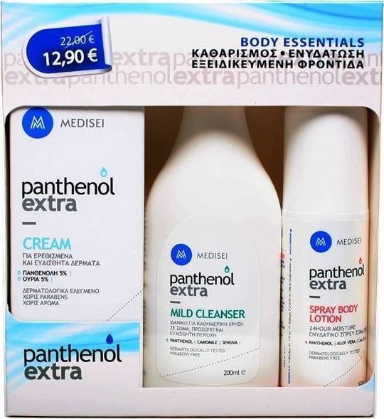 Το Panthenol Extra Body Essentials πακέτο καθαρισμού και εξειδικευμένης φροντίδας σώματος περιλαμβάνει 3 προϊόντα με ενυδατική πανθενόλη.