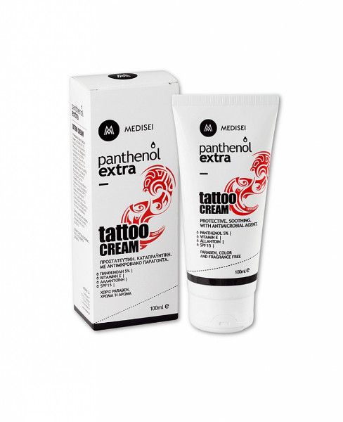 H Panthenol Extra Tattoo Cream με Πανθενόλη 5%, Βιταμίνη Ε και Αλλαντοΐνη, δημιουργεί μια αδιάβροχη, καταπραϋντική ασπίδα προστασίας πάνω από το τατουάζ. Ενυδατώνει την επιδερμίδα χωρίς να ερεθίζει, και βοηθά στην αποφυγή δημιουργίας κρούστας. Ταυτόχρονα, με την προσθήκη αντιμικροβιακού παράγοντα και αντιηλιακού δείκτη προστασίας SPF15, βοηθά στην αποτροπή πιθανών μολύνσεων ενώ προστατεύει το δέρμα και τα χρώματα του τατουάζ από την ηλιακή ακτινοβολία.